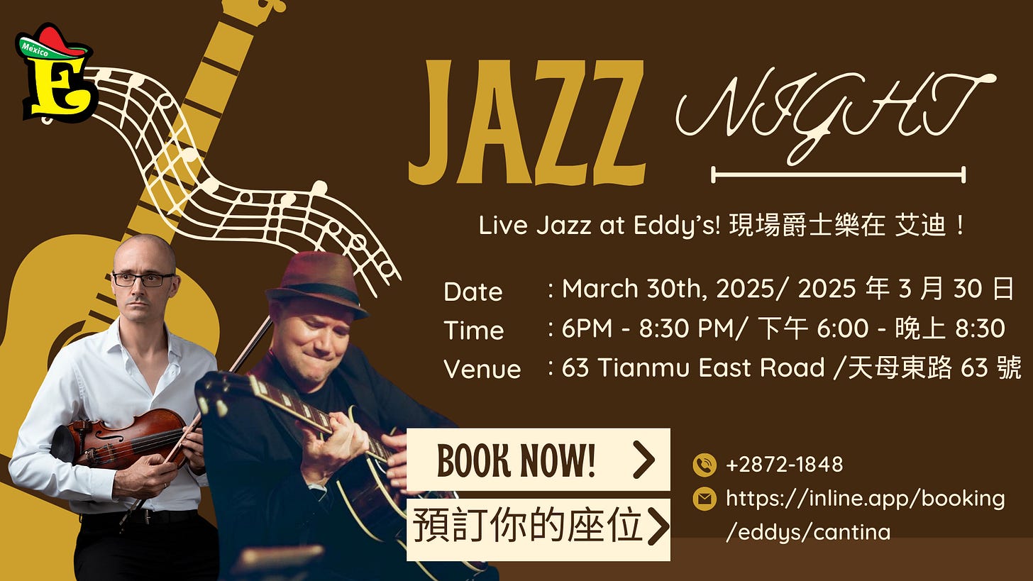 我們為您準備了一場特別的活動!本週日 3 月 30 日 晚上,來 Eddy’s Cantina,享受一場精緻的爵士之夜,由一組精彩的雙人組合帶來流暢悅耳的音樂。