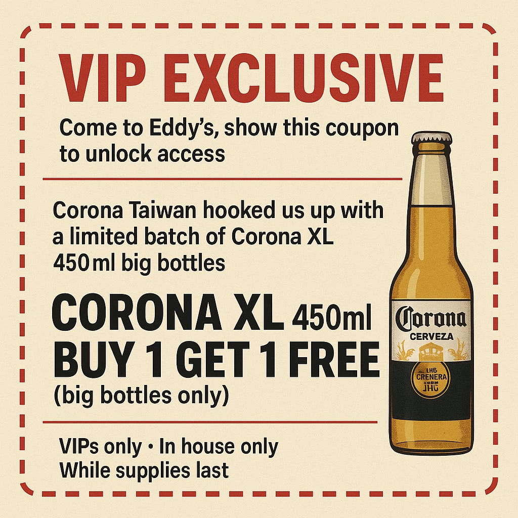 Corona 台灣特別提供一批數量有限的 Corona XL 450ml 大瓶啤酒,只在 Eddy’s。因為數量真的不多,這個優惠只開放給 看到這封電子報的 VIP 會員。