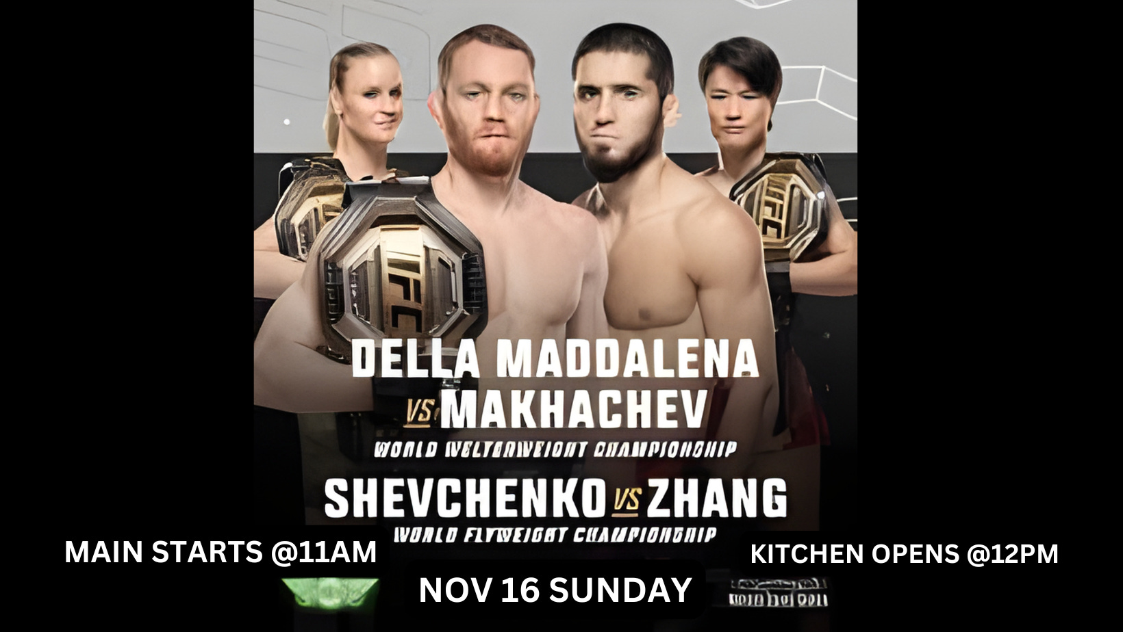 The main card starts at 11:00am, and you can grab lunch from 12:00pm while watching one of the best fight cards of the year, featuring a huge main event where Islam Makhachev moves up to fight Jack Della Maddalena for the belt. Come early, lock in your seat, and enjoy every round with tacos, wings, nachos, and cold beer.