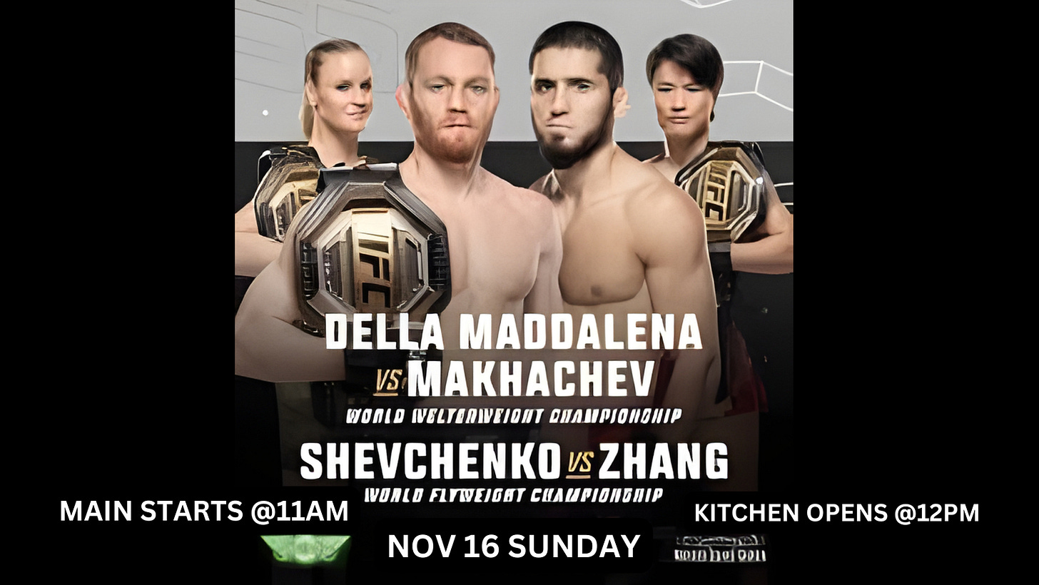 一邊吃午餐一邊看今年最猛的賽事之一 主打是 Islam Makhachev 升量級挑戰 Jack Della Maddalena 金腰帶。歡迎提早來卡位 和一群格鬥迷一起看比賽 吃塔可 雞翅 玉米片 配冰啤 最享受。