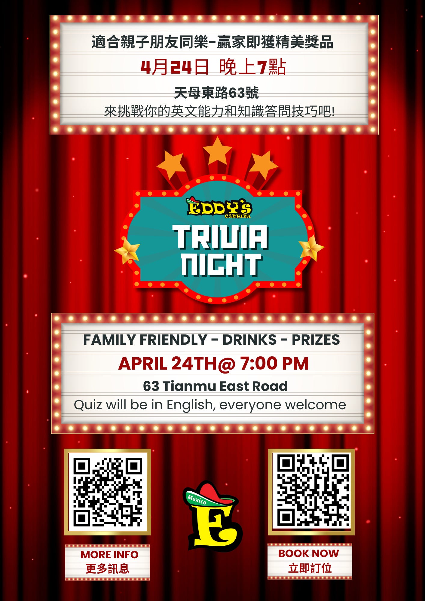 請特別注意:我們以前的 Trivia Night 是晚上 7:30 開始,從現在起改為晚上 7:00 開始。